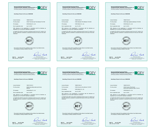此次獲得認證的六大產(chǎn)品包括通用強效型瓷磚膠TA-S100、經(jīng)濟型瓷磚膠TA-S101、重磚型瓷磚TA-S106、隨意貼瓷磚膠TA-S109、瓷磚填縫劑(窄縫防水型)TF-M101、快硬防水漿料WM-201并全部取得EC1plus等級。