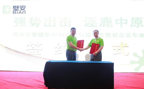 東方雨虹民建公司副總經(jīng)理熊衛(wèi)鋒先生為大會(huì)致辭,他表示,憑借東方雨虹的優(yōu)質(zhì)產(chǎn)品服務(wù),創(chuàng)新創(chuàng)客模式,壁安品牌發(fā)展前景巨大。民建公司壁安粘合劑事業(yè)部總經(jīng)理陳明先生向在場(chǎng)嘉賓闡述了壁安品牌的由來及其戰(zhàn)略規(guī)劃,“相信創(chuàng)客,深度分享;相信合作,全面賦能”是壁安平臺(tái)給與合作伙伴的承諾與希冀。隨后,陳明先生代表壁安品牌與鄭州壁安建筑材料有限公司董事長(zhǎng)張萬祥先生現(xiàn)場(chǎng)簽約,達(dá)成戰(zhàn)略合作協(xié)議。