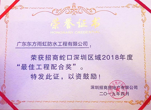 4月19日,“共筑大灣區,精誠贏未來——2019年招商蛇口深圳區域供應商大會”在深圳召開。東方雨虹憑借優質產品及高效服務榮獲招商蛇口深圳區域2018年度“最佳工程配合獎”。