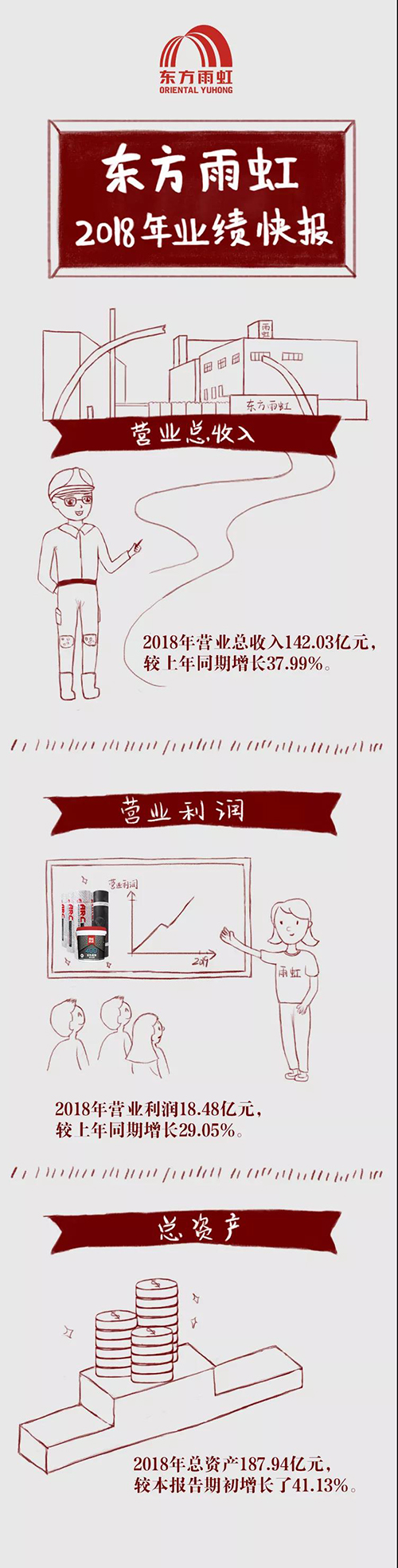 2月25日,東方雨虹公告2018年度業績快報。 報告期內,公司實現營業總收入142.03億元,較上年同期增長37.99%,主要系隨著公司品牌影響力不斷提升,產品銷量同比增長,材料銷售業務和施工服務業務規模均有所增長所致;營業利潤18.48億元,較上年同期增長29.05%;利潤總額18.52億元,較上年同期增長28.91%;歸屬于上市公司股東的凈利潤15.18億元,較上年同期增長22.54%;基本每股收益1.01元,較上年同期增長21.69%,主要原因是報告期公司營業狀況整體向好,主要產品的銷售收入、施工收入繼續增加,毛利潤逐步提高所致。 報告期公司財務狀況良好,截至2018年12月31日,公司總資產187.94億元,較本報告期初增長了41.13%,主要是公司經營規模擴大所致。