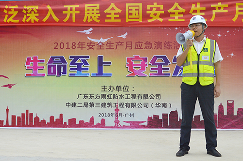 6月15日,廣東東方雨虹聯(lián)合中建二局第三建筑工程有限公司(華南)共同主辦的2018年安全生產(chǎn)月應(yīng)急演練活動在廣州信達(dá)金茂廣場項目成功舉辦。廣東東方雨虹質(zhì)安、項目管理人員及項目現(xiàn)場各單位項目經(jīng)理、施工員約100余人參與本次活動。