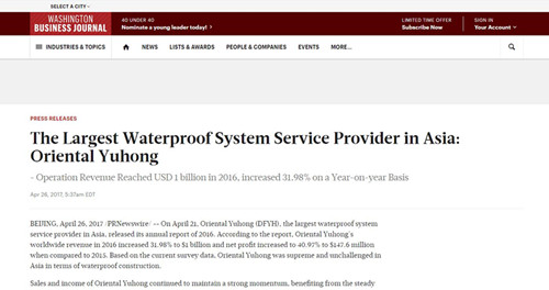 東方雨虹的市場表現都有著中國建筑防水領域風向標的作用。4月21日,東方雨虹發布2016年年報,據報告顯示,2016年東方雨虹實現營業總收入70億元,同比增長31.98%;凈利潤10.29億元,同比增長40.97%。如此靚麗的成績單一經發布,受到了包括Yahoo!、Washington Business Journal、TheStreet、MarketWatch等200余家國際媒體的關注。
