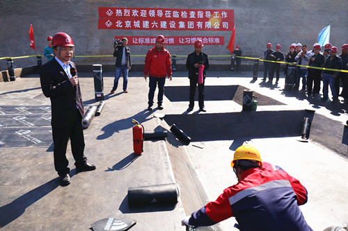 3月31日,北京市懷柔區(qū)建委質(zhì)監(jiān)站站長單焜組織21家懷柔區(qū)在建施工單位代表參觀懷柔新城03街區(qū)棚戶區(qū)改造項目,北京城建六建設(shè)集團有限公司項目經(jīng)理刁大勇、北京城建遠東建設(shè)投資集團項目經(jīng)理王建明、北京東方雨虹直屬業(yè)務(wù)三部總經(jīng)理黃海濤陪同參觀,懷柔區(qū)電視臺等媒體跟蹤報道。