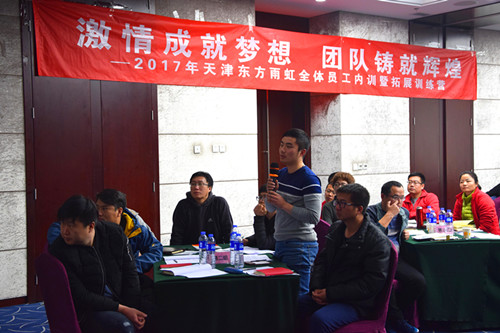 業(yè)務(wù)系統(tǒng)課程培訓(xùn)在最后一日進(jìn)行,由外聘講師從銷售心態(tài)、銷售流程、銷售技巧三方面系統(tǒng)地講授了銷售技巧課程,為業(yè)務(wù)人員在2017年的業(yè)務(wù)工作注入了強(qiáng)心劑。整個(gè)集訓(xùn)期間,培訓(xùn)課程安排緊湊,利用晚餐后時(shí)間,天津東方雨虹副總經(jīng)理周振生為大家?guī)怼豆芾砼c營銷》課程的精彩分享,大家受益匪淺。 通過本次集訓(xùn),使全體員工在體能與意志方面得到充分鍛煉,提升了整個(gè)團(tuán)隊(duì)的協(xié)作意識(shí),同時(shí)增強(qiáng)了業(yè)務(wù)系統(tǒng)的營銷實(shí)戰(zhàn)經(jīng)驗(yàn)。厲兵秣馬,枕戈待旦,天津東方雨虹將在2017年擁抱機(jī)遇,鏖戰(zhàn)本土,乘勝前進(jìn)。