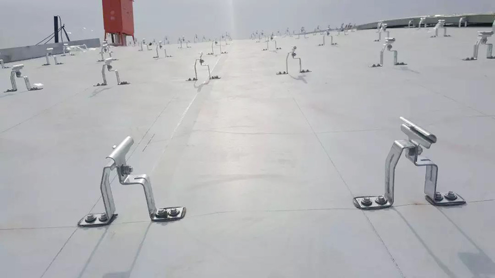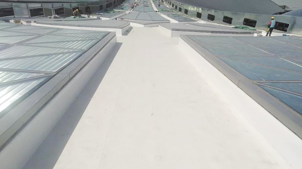該項目屋面防水等級為一級,在屋面圍護系統(tǒng)中,指廊部分采用1.5mm織物內(nèi)增強型TPO防水卷材設(shè)置于鍍鋅鋼板與巖面保溫層間,通過鍍鋅鋼支座機械固定于幾字形檁條,搭接邊采用熱風(fēng)焊接工藝。核心區(qū)與指廊區(qū)采光帶間、采光帶與屋面間通過天溝進行分隔,天溝部分采用2.0mm織物內(nèi)增強型TPO防水卷材,防水層采用底部無穿孔固定+天溝側(cè)壁滿粘的工法,防水層完成后卷材直接外露使用。