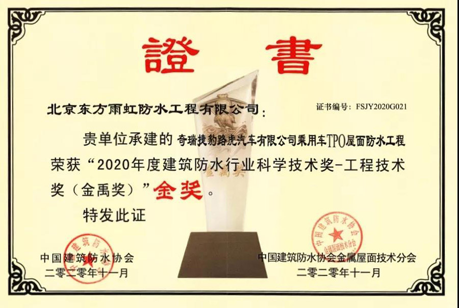 近日,中國建筑防水協會和《中國建筑防水》雜志社聯合在全行業開展了2020年度“建筑防水行業科學技術獎——工程技術獎(金禹獎)”評選活動。東方雨虹(ORIENTAL YUHONG)3項承建項目分別獲2020年度 “建筑防水行業科學技術獎——工程技術獎(金禹獎)”金獎,“建筑防水行業科學技術獎——工程技術獎(金屬圍護系統金禹獎)”金獎、銀獎。評選活動開展的7年間,東方雨虹(ORIENTAL YUHONG)已獲金獎11枚,銀獎6枚。
