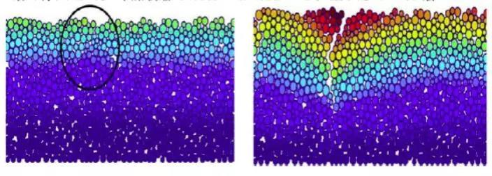 水份向表面的遷移速率時,在靠近表面的粒子之間將會形成復雜的毛細管體系,如圖 3和圖4所示,并在毛細管壁產生毛細壓力 Pc,使毛細孔壁之間或由液體膜分開的兩顆粒之間產生收縮引力 Fa,使得兩粒子被壓縮靠近,此時混凝土尚未形成強度,當收縮驅動力大于顆粒間的抗拉強度時,則出現塑性收縮裂縫,主要發生于早期。
