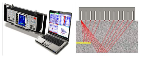 為尋找造成地下防水工程滲漏的原因,以更好地控制防水工程質量,雨虹修繕引進超聲波斷面成像儀,可用于混凝土結構中的外部侵入物、缺陷、裂縫以及管道及蜂窩等缺陷的無損檢測。如果混凝土內部的缺陷足夠大,激發的超聲波會被該缺陷提前發反射,因為反射線路徑更短,由缺陷反射的信號會早于混凝土底面反射的信號到達接收端。信號處理軟件依據每排換能器接收到的反射脈沖的到達時間,來推斷混凝土內部缺陷的位置,最大可探查1.8m。