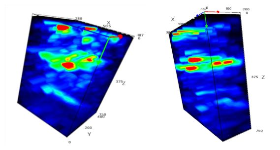 三維立體掃描,側墻部位其內部孔隙率非常多,多集中在表層以及200mm到300mm之間區域,且存在貫穿性裂縫。