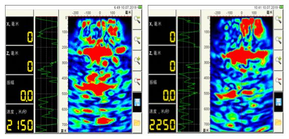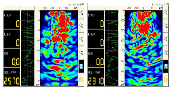 單點掃描,大多數點從表層至300mm處均有連續性缺陷。內部孔隙率也非常高,目前存在滲水情況。對照分析,內部存在連續性的缺陷,符合現場滲漏水;