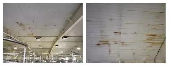 某生產(chǎn)車(chē)間頂棚防腐項(xiàng)目頂棚采用金屬板、巖棉復(fù)合鋼板,由于金屬頂棚板面防腐漆質(zhì)量較差,生產(chǎn)車(chē)間內(nèi)部溫度、濕度較高,最終導(dǎo)致室內(nèi)頂棚金屬板銹蝕嚴(yán)重。