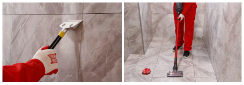 用吸塵器或毛刷清理粉塵:使用粉塵吸塵器將瓷磚縫隙內(nèi)部的粉塵吸干凈,瓷磚縫隙兩側(cè)2cm寬采用抹布擦洗干凈,保證瓷磚縫隙內(nèi)不潮濕,無粉塵、顆粒、油漬、疏松物等,同時清潔瓷磚表面污染物。如擔(dān)心使用吸塵器清潔仍不夠徹底,可繼續(xù)采用毛刷清理吸塵器處理不到或難以處理的位置,保證所有的瓷磚縫隙干燥無粉塵。