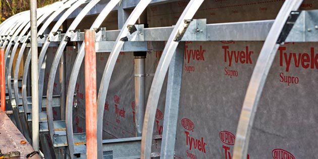 由于高節能的設計要求,該項目采用了特衛強®加強型透汽膜和AirGuard®隔汽膜產品系統。特衛強®加強型透汽膜安裝在外墻的背部用來密封外部的檐口部位,AirGuard®隔汽膜安裝在隔熱鋼架和維護系統的內襯之間,安裝在第二道鋼結構和鋁制擋雨屏后面的特衛強®加強型透汽膜作為氣密材料可以提供良好的防風、抗撕裂和透汽性能,而AirGuard®隔汽膜可進一步加強該系統的隔汽性能和氣密性能。